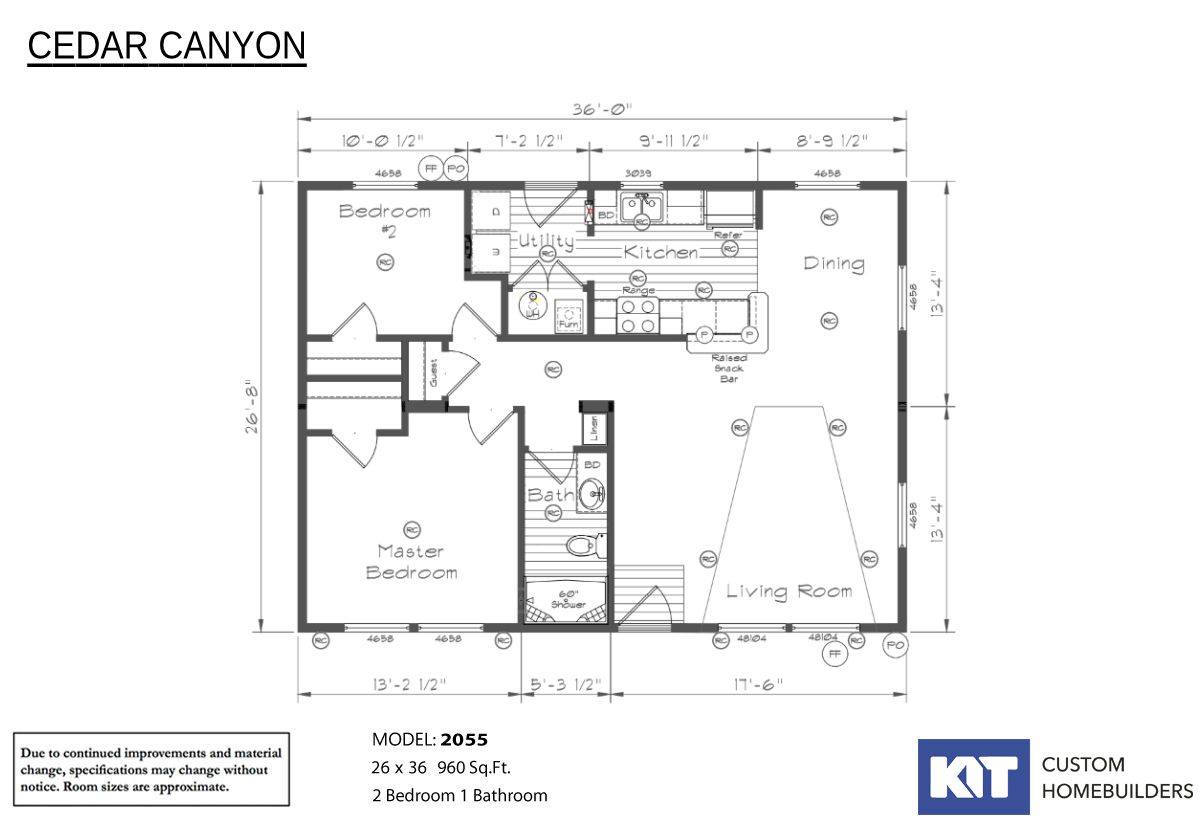 2 Bdr / 1 Bath / 960 sqft. – This Cedar Canyon 2055 is another example of the fine craftsmanship of KIT Custom Homebuilders. See your local KIT retailer for more information.